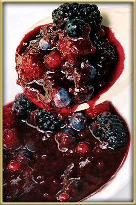 β. Προσθέτουμε στην ίδια κατσαρόλα τα φρούτα του δάσους, το τζίντερ, την κανέλα, 1 μικρό ποτήρι νερό και 1 κουταλιά της σούπας μηλόξυδο.